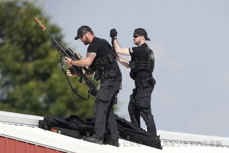 特朗普遇刺现场,事发前在屋顶高处负责禁戒的两名特工在准备架设狙击枪。