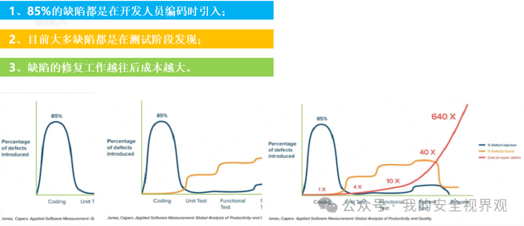 在软件质量领域,有一个先驱者叫琼斯,在他的报告中提出以下三张图及对应着三个观点。从安全角度来看,依旧是适用的:
