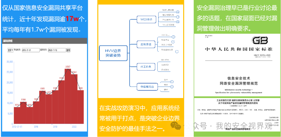 第三是国家对于漏洞的重视程度也在逐渐提高和明确。随着对网络安全的重视,各行业对漏洞都有一些明确的要求,比如上面右图这种漏洞管理的规范,甚至还专门建设漏洞管理平台来收集。