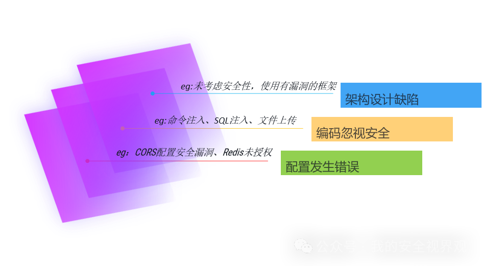 第一个是还没开始写代码,即在设计阶段做技术架构选型与设计时,不遵守安全设计原则或未充分考虑安全性,就可能引入漏洞。如: