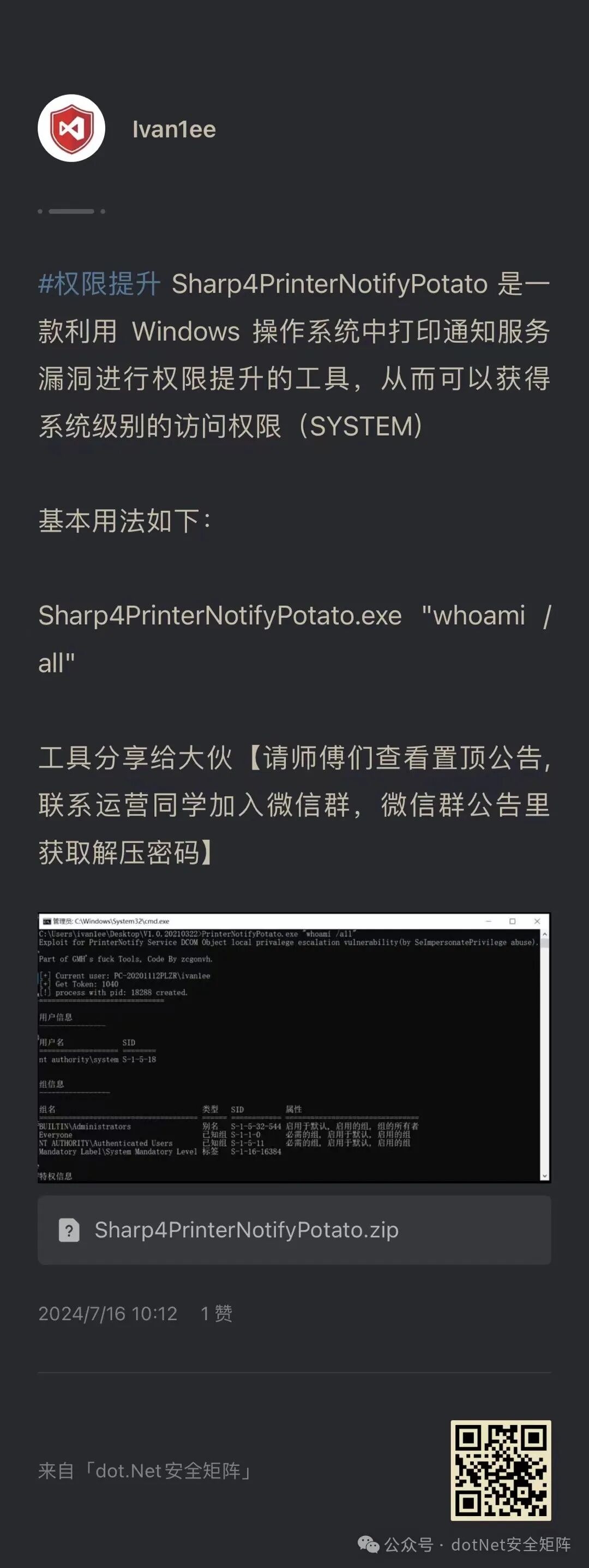 Sharp4PrinterNotifyPotato 利用了 Windows 中的 DCOM 服务对象和打印通知服务中的权限配置漏洞,通过 SeImpersonatePrivilege 权限进行攻击,从而实现本地权限提升。