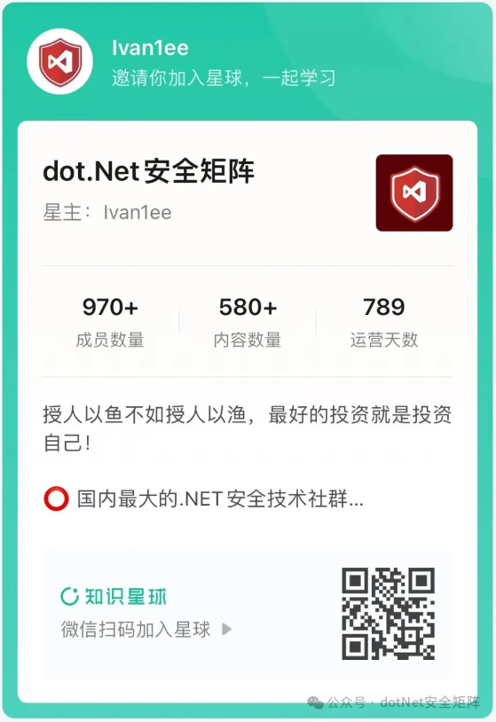 为了更好地应对基于.NET技术栈的风险识别和未知威胁,dotNet安全矩阵星球从创建以来一直聚焦于.NET领域的安全攻防技术,定位于高质量安全攻防星球社区,也得到了许多师傅们的支持和信任,通过星球深度连接入圈的师傅们,一起推动.NET安全高质量的向前发展。