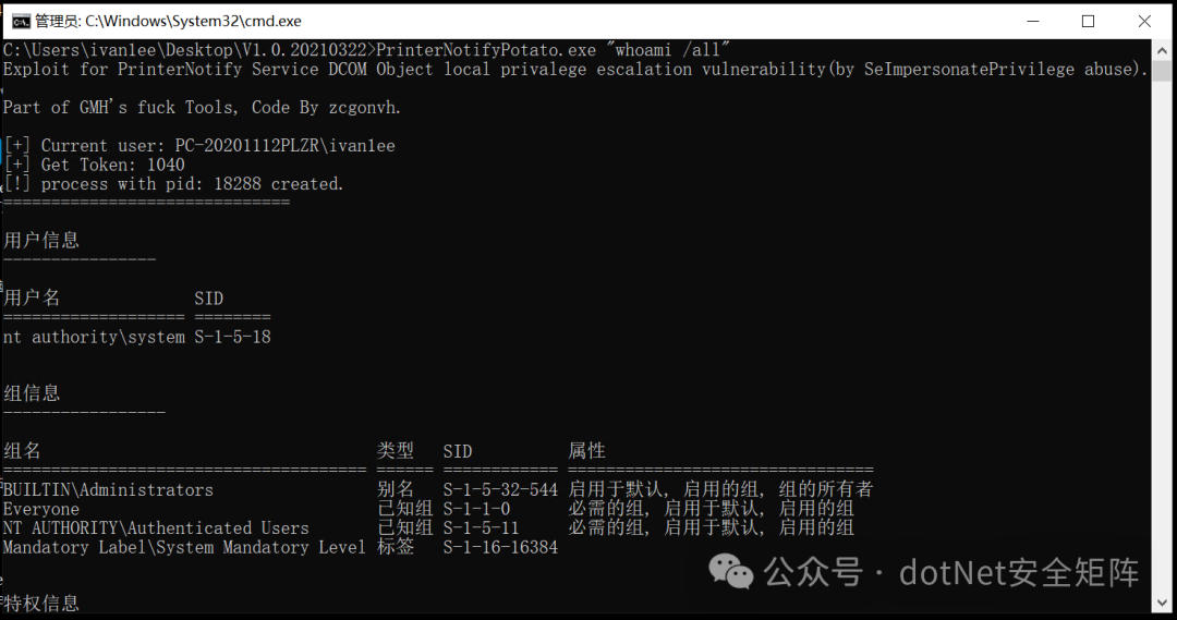 Sharp4PrinterNotifyPotato.exe "whoami /all"