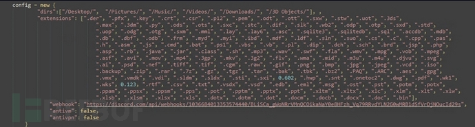 该恶意软件从某些配置开始,包括要加密的目录、要攻击的文件扩展名和一个充当C&C的Discord网络钩子(webhook)。