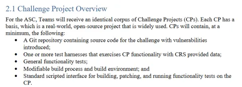 AIxCC官网公布的赛制说明中也介绍,在比赛中所有参赛团队都会获得一个挑战项目集,其中每个挑战项目都会基于现实世界中正在运行的开源项目引入漏洞,再以GitHub存储库的形式发放,参赛团队编写的CRS自动化推理系统需要对代码存储库中的代码进行程序分析(代码审计),通过编写新的代码来实现对漏洞的发现、验证和修复,最终提交一个修复补丁文件证明自身能够独立实现整个漏洞发现到修复的闭环。