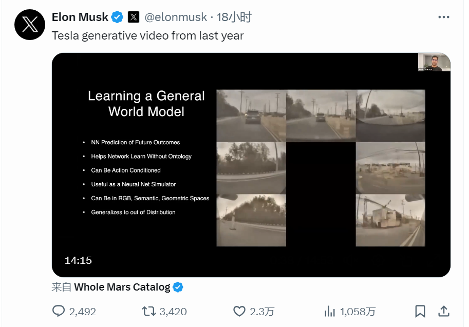 在 Sora 发布后,马斯克发推表示特斯拉用 AI 模拟真实世界驾驶 | 图片来源:X 截图