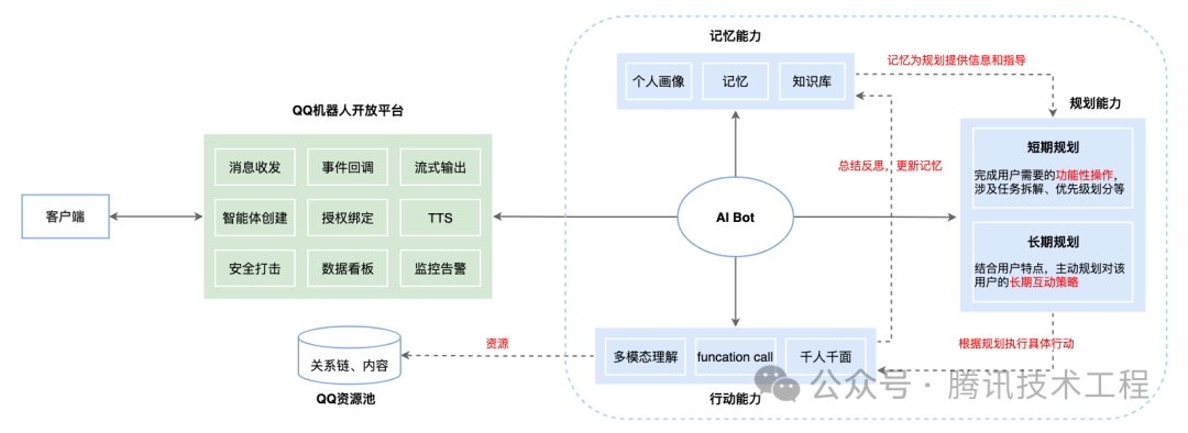 下图就是基于QQ机器人平台开发的一个具有AI Agent能力的智能体架构图。