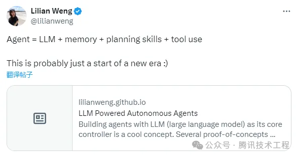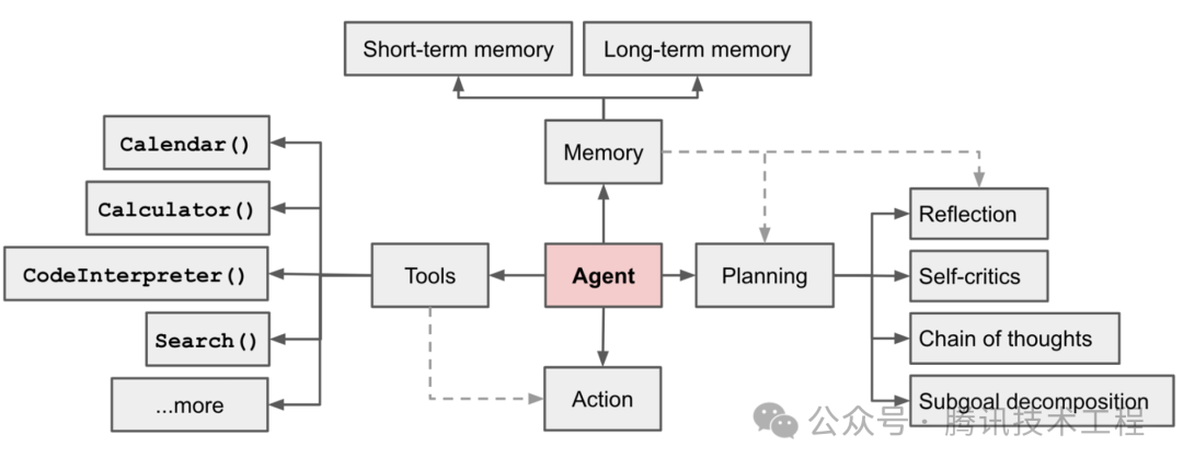 目前一种比较主流的定义来自OpenAI人工智能应用研究负责人Lilian Weng给出的一个AI Agent组成公式: