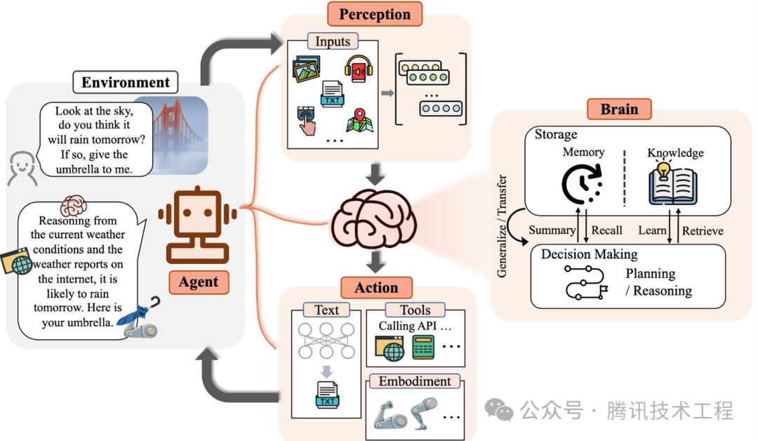 可以看到Agent架构图里包含三个组成部分:大脑(Brain)、感知(Perception)和行动(Action)。这个架构是比较“类人”的,大脑模块作为控制器,承担记忆、思考、决策等基本任务。感知模块感知并处理来自外部环境的多模态信息,动作模块利用工具进行执行并影响周围环境。举一个例子来说明工作流程:当人类询问是否会下雨时,感知模块将指令转换为LLM可以理解的表示。然后大脑模块开始根据当前天气和互联网上的天气报告进行推理。最后,动作模块做出响应并将雨伞递给人类。通过重复上述过程,智能体可以不断获得反馈并与环境交互。对人类而言。通过重复上述过程,代理可以不断地获得反馈并与环境交互。
