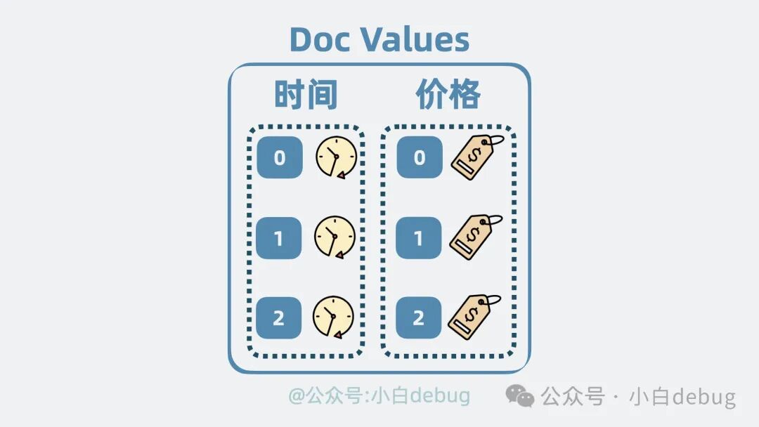 但用户经常需要根据某个字段排序文档,比如按时间排序或商品价格排序。但问题就来了,这些字段散落在文档里。也就是说,我们需要先获取 Stored Fields 里的文档,再提取出内部字段进行排序。也不是说不行。但其实有更高效的做法。我们可以用空间换时间的思路,再构造一个列式存储结构,将散落在各个文档的某个字段,集中存放,当我们想对某个字段排序的时候,就只需要将这些集中存放的字段一次性读取出来,就能做到针对性地进行排序。这个列式存储结构,就是所谓的 Doc Values。