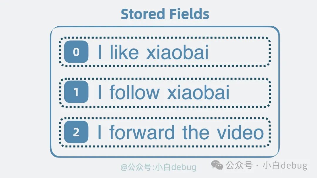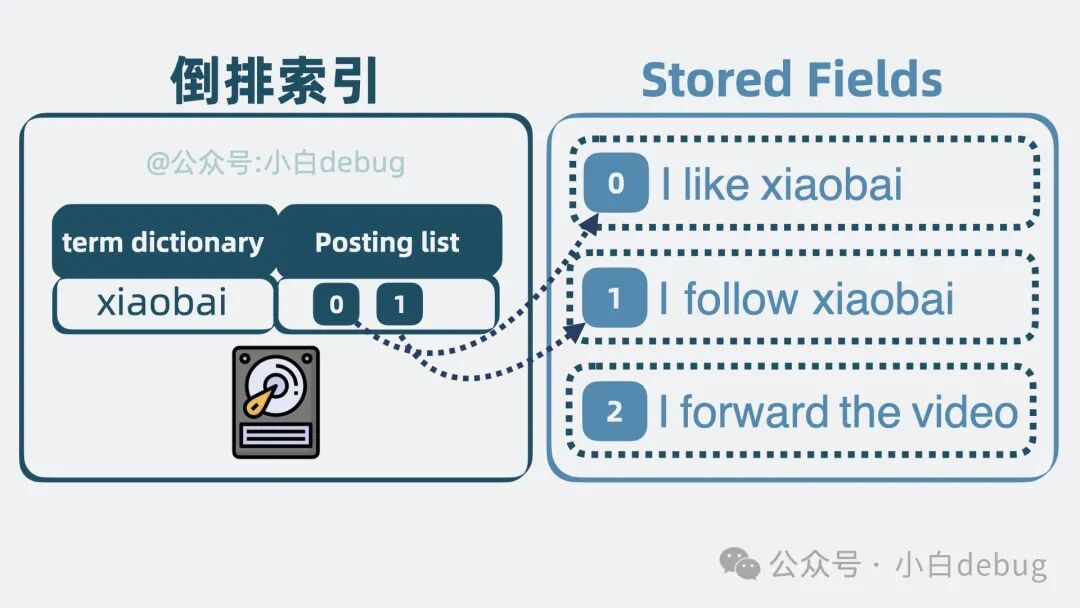 到这里,搜索功能就有了。但有个问题,前面提到的倒排索引,搜索到的是文档 id,我们还需要拿着这个 id 找到文档内容本身,才能返回给用户。因此还需要有个地方,存放完整的文档内容,它就是 Stored Fields(行式存储)。
