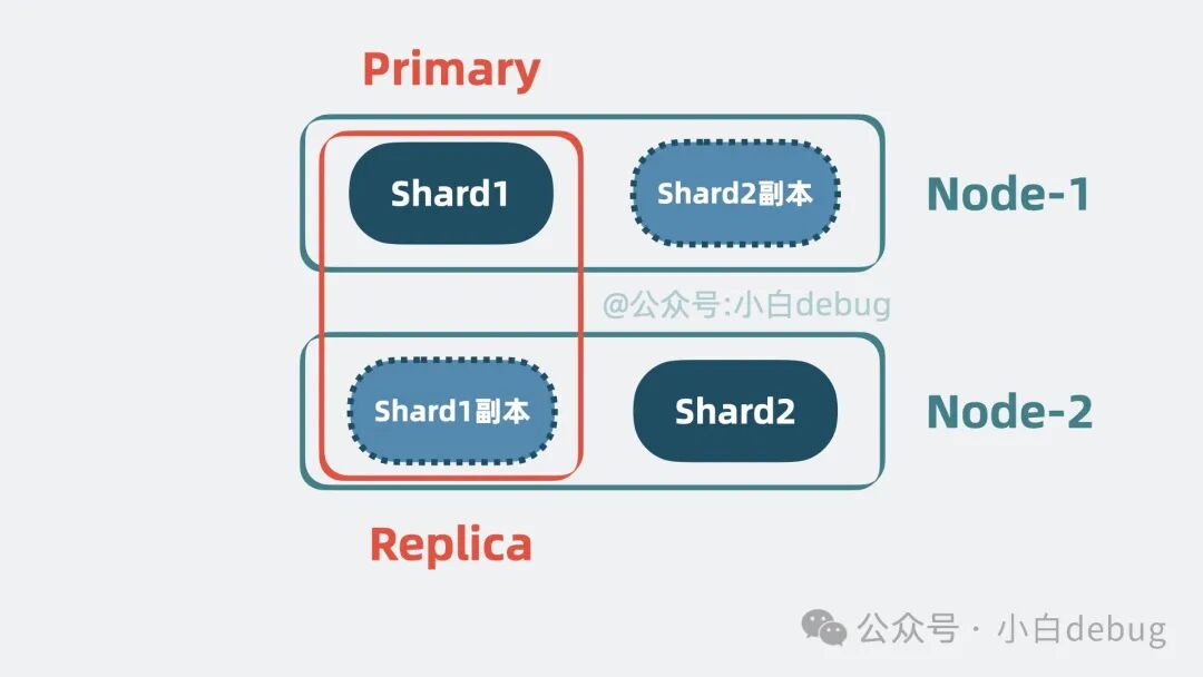 到这里,问题又又来了,如果其中一个 Node 挂了,那 Node 里所有分片 都无法对外提供服务了。我们需要保证服务的高可用。有解决方案吗?有,我们可以给 分片 多加几个副本。将 分片 分为 Primary shard 和 Replica shard,也就是主分片和副本分片 。主分片会将数据同步给副本分片,副本分片既可以同时提供读操作,还能在主分片挂了的时候,升级成新的主分片让系统保持正常运行,提高性能的同时,还保证了系统的高可用。