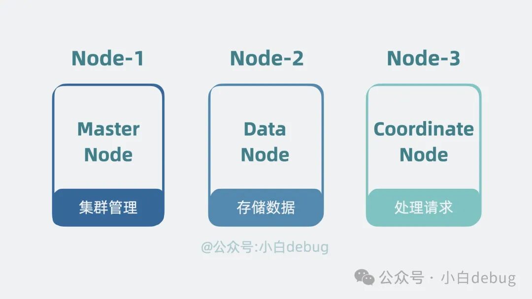 搜索架构需要支持的功能很多,既要负责管理集群,又要存储管理数据,还要处理客户端的搜索请求。如果每个 Node 都支持这几类功能,那当集群有数据压力,需要扩容 Node 时,就会顺带把其他能力也一起扩容,但其实其他能力完全够用,不需要跟着扩容,这就有些浪费了。因此我们可以将这几类功能拆开,给集群里的 Node 赋予角色身份,不同的角色负责不同的功能。比如负责管理集群的,叫主节点(Master Node), 负责存储管理数据的,叫数据节点(Data Node), 负责接受客户端搜索查询请求的叫协调节点(Coordinate Node)。集群规模小的时候,一个 Node 可以同时充当多个角色,随着集群规模变大,可以让一个 Node 一个角色。