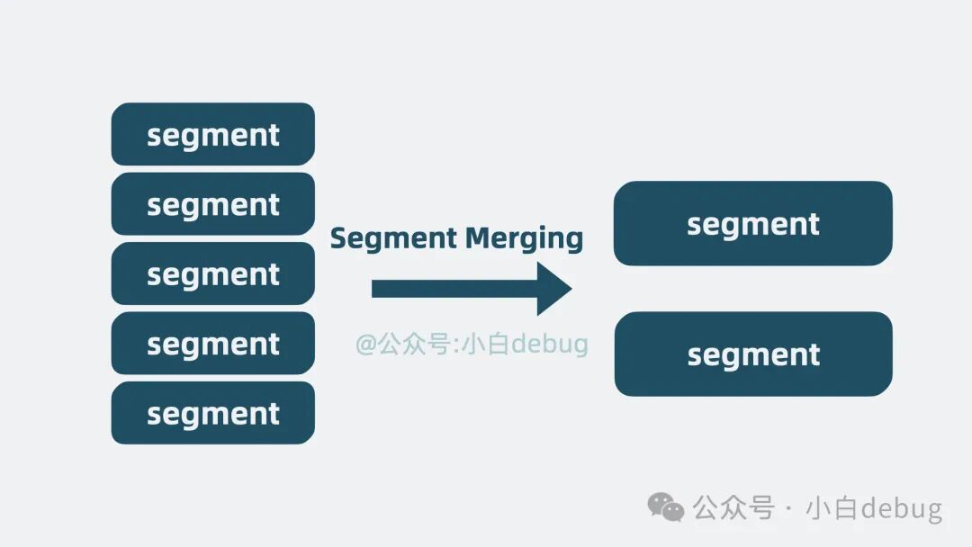 但这也引入了新问题,随着数据量增大,segment 文件越写越多,文件句柄被耗尽那是指日可待啊。是的,但这个也好解决,我们可以不定期合并多个小 segment,变成一个大 segment,也就是段合并(segment merging)。这样文件数量就可控了。