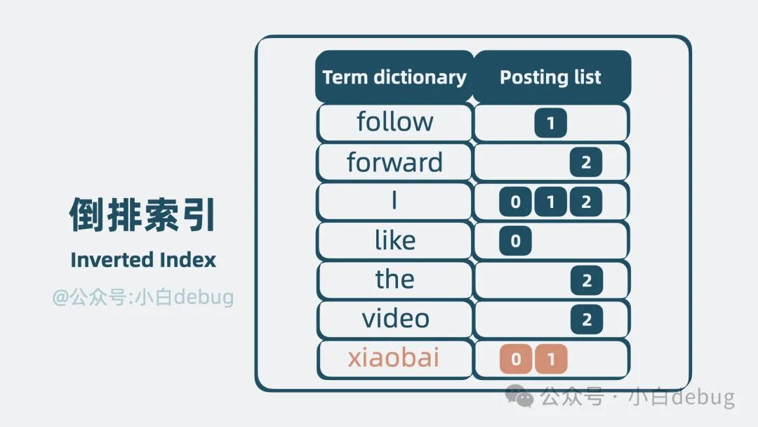 回到文章开头的例子。依次遍历文本匹配是否含有"xiaobai",确实低效。那有更高效的解法吗?有,我们可以对文本进行切分,比如"I like xiaobai"切分为"I"、"like"、"xiaobai"三部分,这个操作叫分词,分词后的每部分,我们称为一个词项,也就是 term。记录词项和文本 id 的关系,于是上面的三段文本就变成了下面这样。
