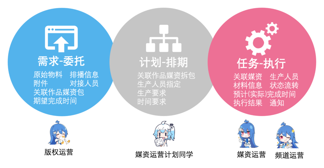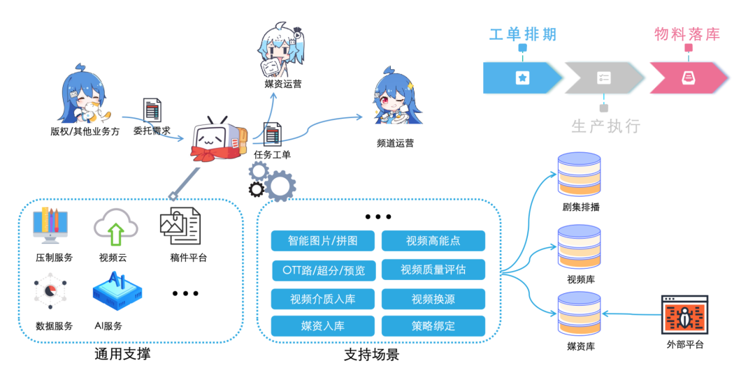 由版权或其他业务方委托需求到生产系统,再以任务工单的形式派发到具体生产人员, 最终产出各种物料进入到各个领域的库中。