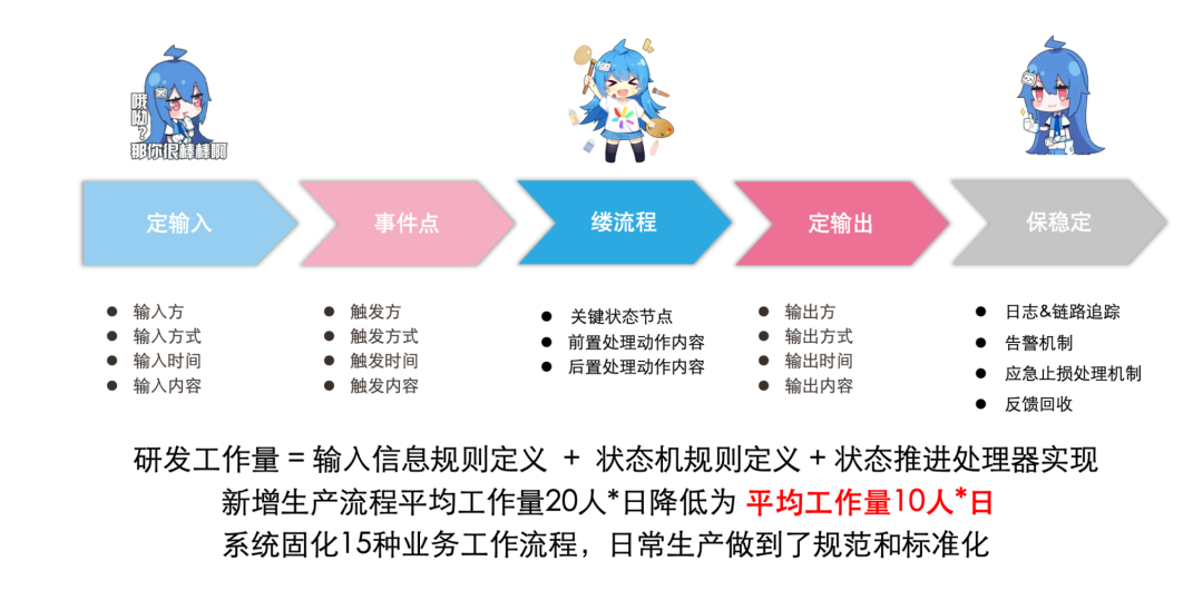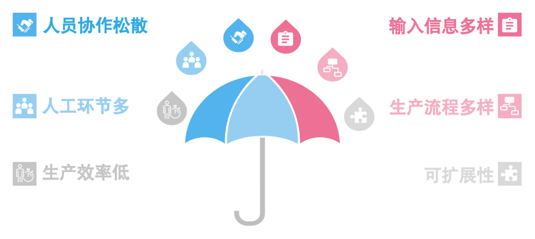 在业务上需要解决人员协作松散、人工环节多、生产效率低的问题,技术上则是输入信息多样、生产流程多样、可扩展性。