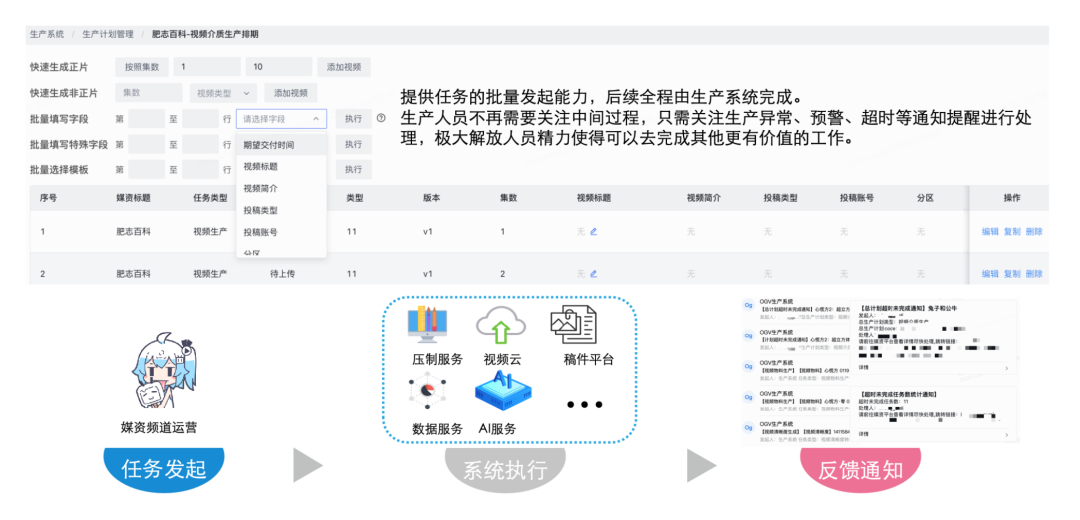 实际生产执行层面 提供任务的批量发起输入编辑能力,提交后全程由生产系统完成。