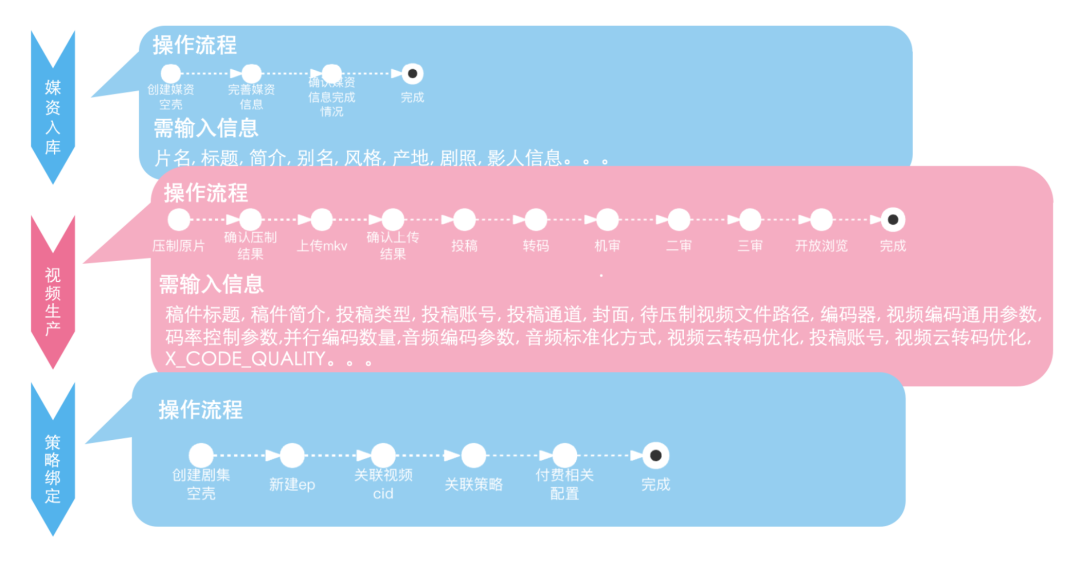 项目发起时对OGV主要核心流程梳理下来主要分为三部分:由媒资入库、视频生产以及策略绑定组成。
