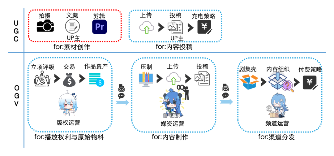 UGC的创作端需要许多辅助用户的轻量化模版工具进行创意产出变现,而OGV的内容主要是以外部采购的方式引入后进行剪辑、压轴、添加字幕等处理,使用的工具相对重量化一些,相应的在投稿阶段也会有一些针对OGV场景的定制化要求并且需要掌握整个生产流程,而UGC的链路对于平台来说主要是掌握在投稿阶段,所以直接使用UGC创作端工具不太合适。