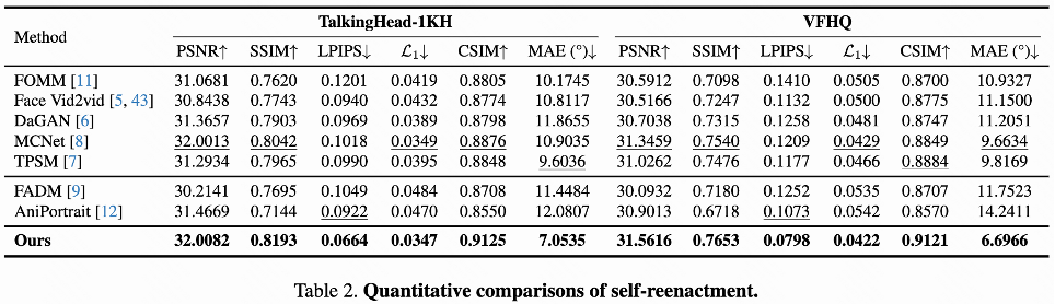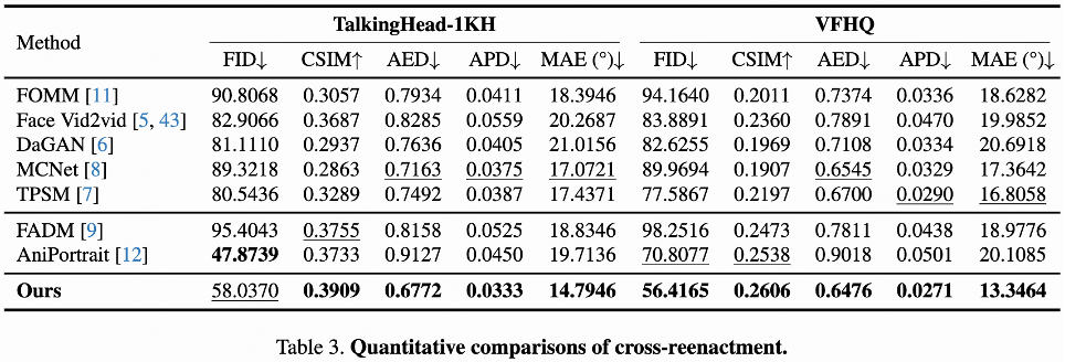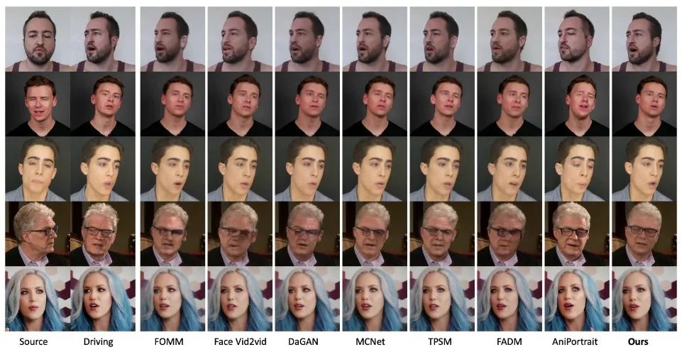 跨身份驱动:由如上跨身份驱动对比结果可见,与已有的方法相比,LivePortrait可以准确地继承驱动视频中细微的眼部和嘴部动作,同时在姿态较大时也比较稳定。LivePortrait在生成质量上略弱于基于扩散模型的方法AniPortrait[11],但与后者相比,LivePortrait具有极快的推理效率且需要较少的FLOPs。