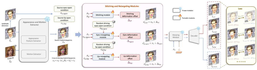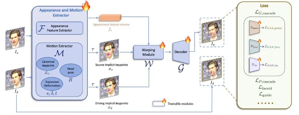 在第一阶段模型训练中,LivePortrait对基于隐式点的框架,如Face Vid2vid[1],做了一系列改进,包括: