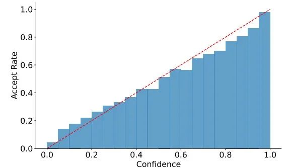 上述例子中,EAGLE-2根据预测草稿token的难易程度决定草稿树的结构,精确计算难易程度(接受率)需要原始大语言模型的计算结果,这违背了投机采样减少对原始大语言模型访问的初衷。幸运的是,EAGLE的草稿模型的置信度与接受率(难易程度)高度正相关。下图显示了草稿模型不同置信度区间的草稿token的平均接受率,红色虚线连接(0,0)和(1,1)。由此可见,草稿模型的置信度可以作为接受率的有效近似。