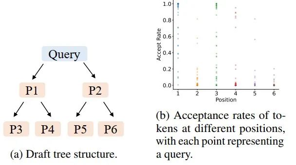EAGLE-2的作者们在Alpaca数据集上进行了简单的测试,下图显示了不同位置的草稿token的接受率,左图中的P1-P6代表位置,与右图的横轴坐标对应。实验结果显示,在相同的位置上的草稿token的接受率也有较大的差异,这说明了使用动态草稿树可能取得比静态草稿树更好的效果。