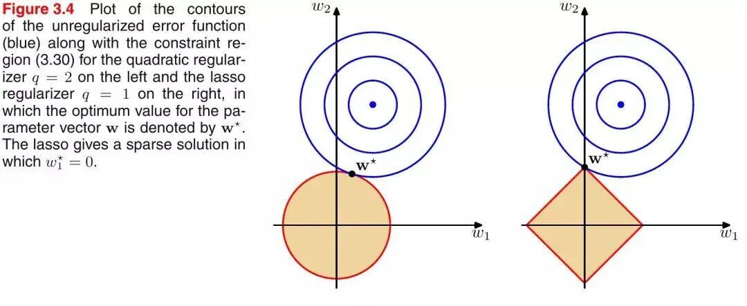 引入PRML一个经典的图来说明下L1和L2范数的区别,如下图所示: