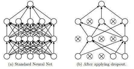 Dropout是深度学习中经常采用的一种正则化方法。它的做法可以简单的理解为在DNNs训练的过程中以概率p丢弃部分神经元,即使得被丢弃的神经元输出为0。Dropout可以实例化的表示为下图: