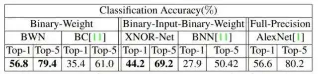 可以看到的是权重二值化神经网络(BWN)和全精度神经网络的精确度几乎一样,但是与异或神经网络(XNOR-Net)相比而言,Top-1 和 Top-5 都有 10+% 的损失。