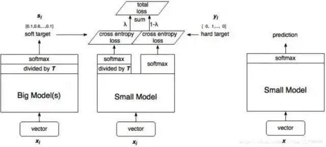 这两个损失函数的重要程度可通过一定的权重进行调节,在实际应用中,T 的取值会影响最终的结果,一般而言,较大的 T 能够获得较高的准确度,T(蒸馏温度参数) 属于知识蒸馏模型训练超参数的一种。T 是一个可调节的超参数、T 值越大、概率分布越软(论文中的描述),曲线便越平滑,相当于在迁移学习的过程中添加了扰动,从而使得学生网络在借鉴学习的时候更有效、泛化能力更强,这其实就是一种抑制过拟合的策略。知识蒸馏的整个过程如下图: