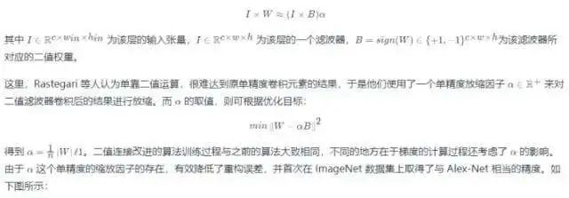 之前的二值连接算法只对权重进行了二值化,但是网络的中间输出值依然是单精度的,于是 Rastegari 等人对此进行了改进,提出用单精度对角阵与二值矩阵之积来近似表示原矩阵的算法,以提升二值网络的分类性能,弥补二值网络在精度上弱势。该算法将原卷积运算分解为如下过程: