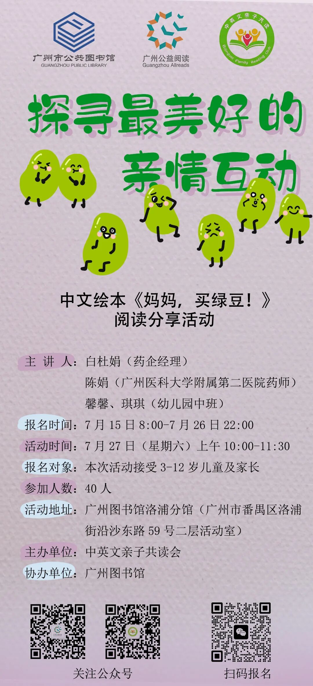 7月27日上午,志愿者白杜鹃和陈娟带着小志愿馨馨和琪琪在广州图书馆洛浦分馆与你一起分享绘本《妈妈,买绿豆!》。