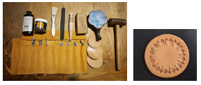 皮艺以旋转刻刀及印花工具,在皮革上进行刻划、敲击、推拉等创作,并经过描绘、着色、层染、烫色、抛光、定形,半浮雕凹凸压制等一系列工序,几十道工艺,纯手工制作出各种立体图案及效果,其特点是使图案纹样在皮革表层雕琢出凹凸的层次感及优美纹饰。