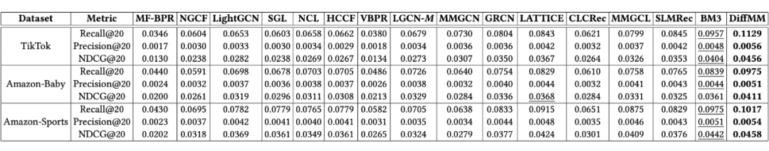 作者在三个公开数据集上对比了多种类型的最新基线模型,包括传统的协同过滤方法、基于 GNN 的方法、生成扩散推荐方法、自监督推荐方法以及 SOTA 的多模态推荐方法。通过进行广泛而充分的实验,结果显示提出的 DiffMM 在总体性能上表现最优。