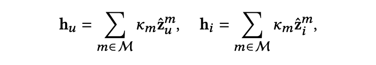 为了生成最终的用户(物品)表示 以进行预测,作者首先对所有的模态感知嵌入 和相应的模态感知用户-物品图 进行聚合: