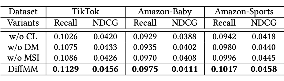 为了验证所提出方法各个模块(i.e., 多模态图扩散模型,多模态图聚合,和跨模态对比增强)的有效性,作者进行了细致的消融实验。实验结果显示,所提出的各个子组件都能有效地提升推荐效果: