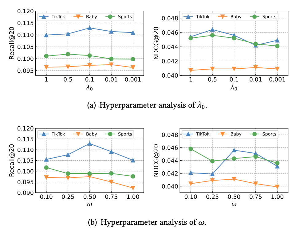 对于所提出的 DiffMM,作者对一些重要的超参数进行了分析,包括多模态图聚合模块中的超参数、模态感知扩散模型中的 MSI 权重: