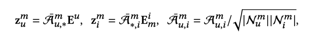 接下来,对用户嵌入 和物品模态特征 进行信息聚合,得到聚合的模态感知嵌入 :