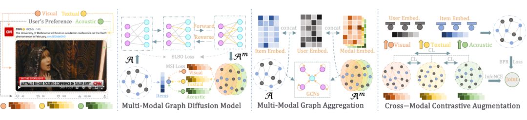 受到扩散模型在保留生成输出基本数据模式方面的成功启发,DiffMM 框架提出了一种创新的多模态推荐系统方法。具体而言,作者引入了一个多模态图扩散模块,用于生成包含模态信息的用户-物品交互图,以增强对不同模态下用户偏好的建模。该框架专注于解决多模态推荐系统中无关或噪声模态特征带来的负面影响。
