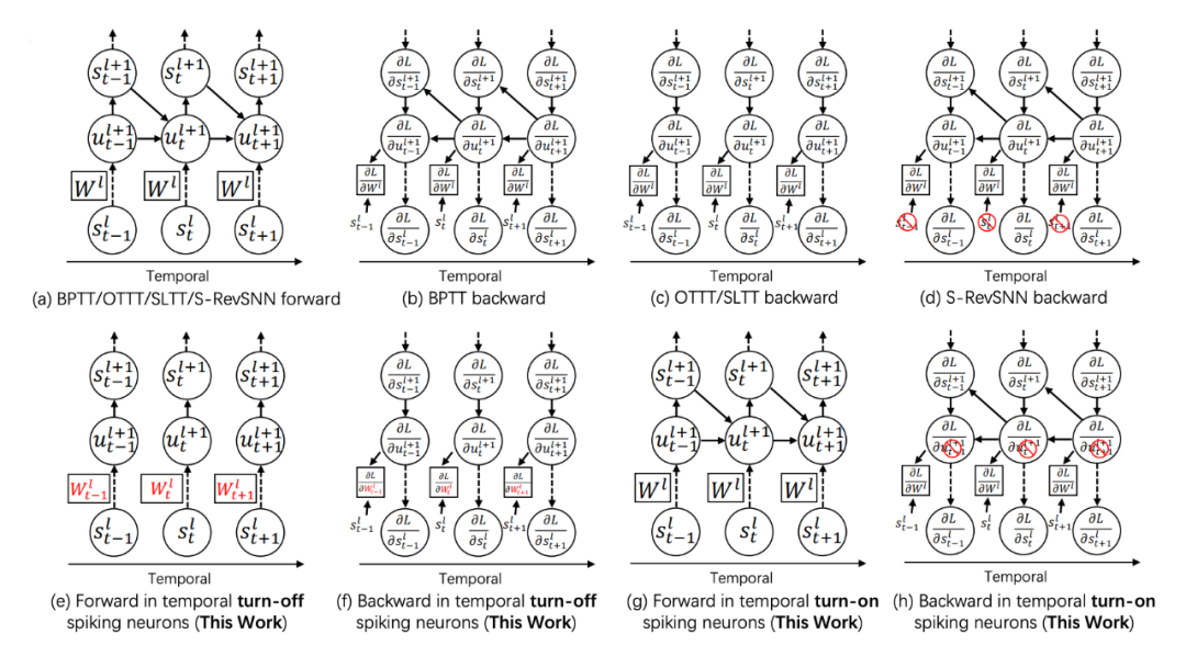 ▲ 图5. T-RevSNN和其他SNN训练优化方法的前传和反传示意图