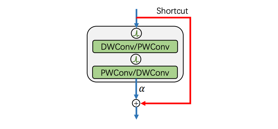其次我们重写设计的基本的 SNN 模块。它由两个深度可分离卷积(DWConv/PWConv)和一个残差连接组成。我们去掉了所有批量归一化(BN)模块,转而去使用将网络中所有层的权重都进行了归一化的方法来稳定训练。 之后我们使用了 ReZero 技术来增强网络在初始化后满足动态等距的能力和促进高效的网络训练。为了保证在推理中只发生加法运算,我们使用重参数化,将 ReZero 的缩放比例(即图 4 中的 α)合并到上一层的权重中。
