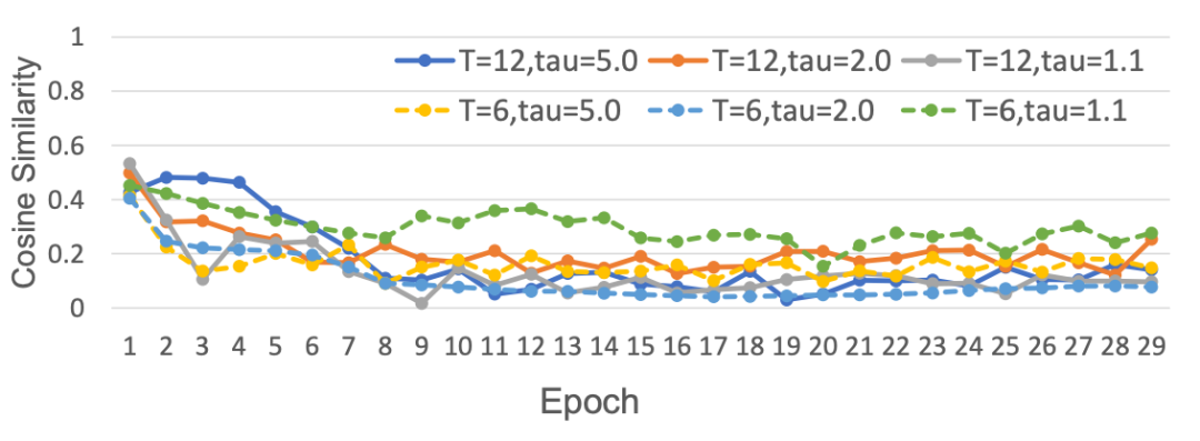 ▲ 图2. 基线与案例2的余弦相似度随训练过程变化图