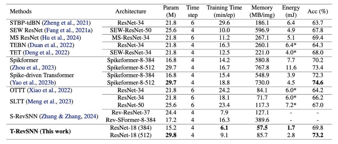 T-RevSNN 在 ImageNet 上的结果如下所示。本文取得了 SNN 域中最快的训练速度和最低的内存消耗。