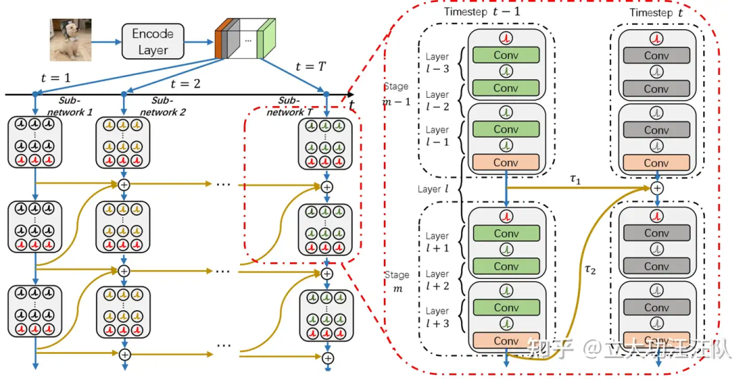 其次,关闭的脉冲神经元不进行时间动态,简化为不重用时间维度的参数,同时通过一次编码输入,将特征和网络分为 T 组,避免增加参数和能耗。第三,为提升性能,采用多级信息传递,重新设计 SNN 块,并调整残差连接以确保有效性。
