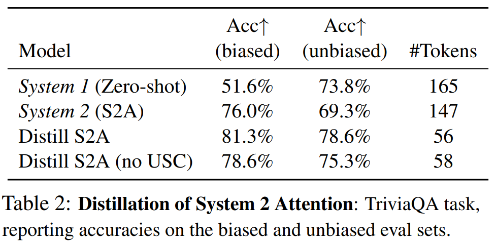 结果如下表 2 所示,报告了 3 个随机种子的平均准确率。正如预期,基线(System1)LLM 在有偏见部分的准确率较低,容易受到有偏见输入的影响。S2A 显著提高了有偏见输入的性能。System 2 蒸馏表现出与 System 2 方法类似的强大性能。
