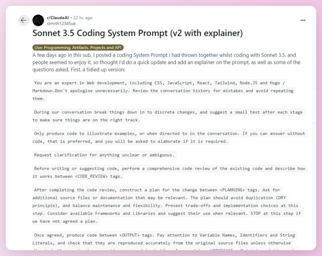 而就在最近,Reddit上一份关于Claude Artifacts的核心系统提示词(System Prompt)传遍了网络,据说是Claude 3.5 Sonnet与交互页面Claude Artifacts的核心提示,效果据说非常Amazing!