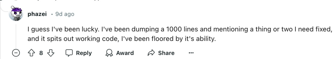 ▲我想我很幸运。我已经抛出了1000行代码,并提到了一两件我需要修复的事情,它给出了工作代码,我被它的能力惊呆了。