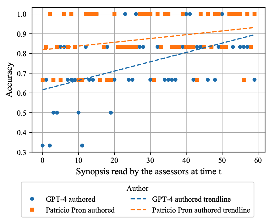 另一个有趣的发现是AI生成文本的可识别性。评估者在阅读过程中,逐渐提高了识别AI生成文本的准确率。这表明GPT-4在没有特定风格指导的情况下,可能会形成某种可识别的"AI风格"。这种风格的存在可能会限制AI在创意写作中的表现,因为真正优秀的文学作品往往需要独特而多变的风格。